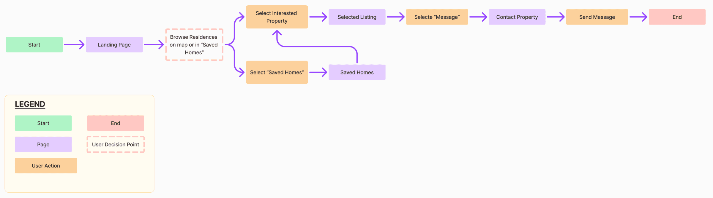 Creating these flows also gave me the chance to start to think about what users would need to filter for in their messages or saved properties. Users mentioned wanting quick filters for previously toured properties, read or unread messages, or filtering for properties that meet specific requirements for the renters or buyers. I kept these in mind as I moved on from user flows to designing.