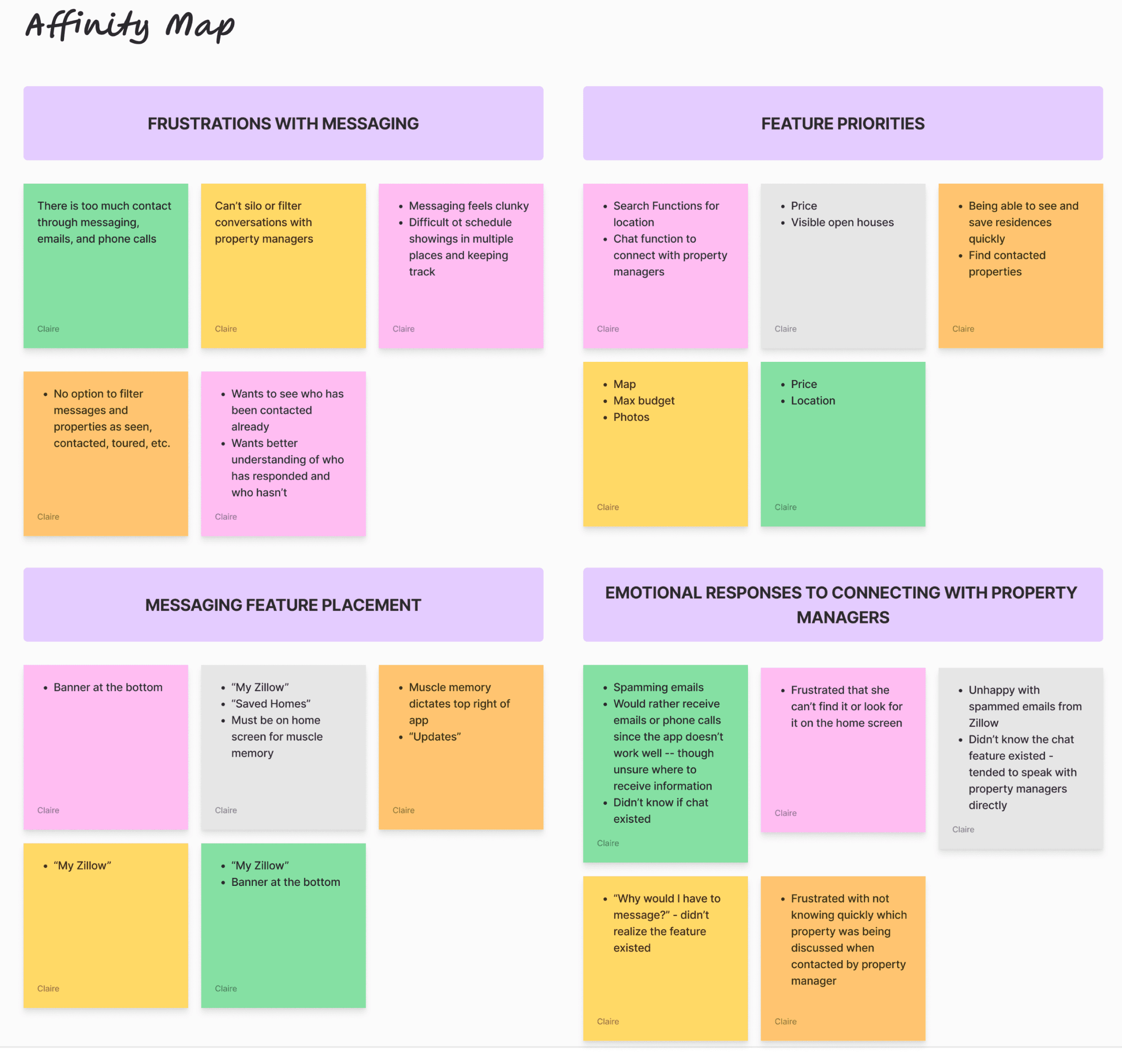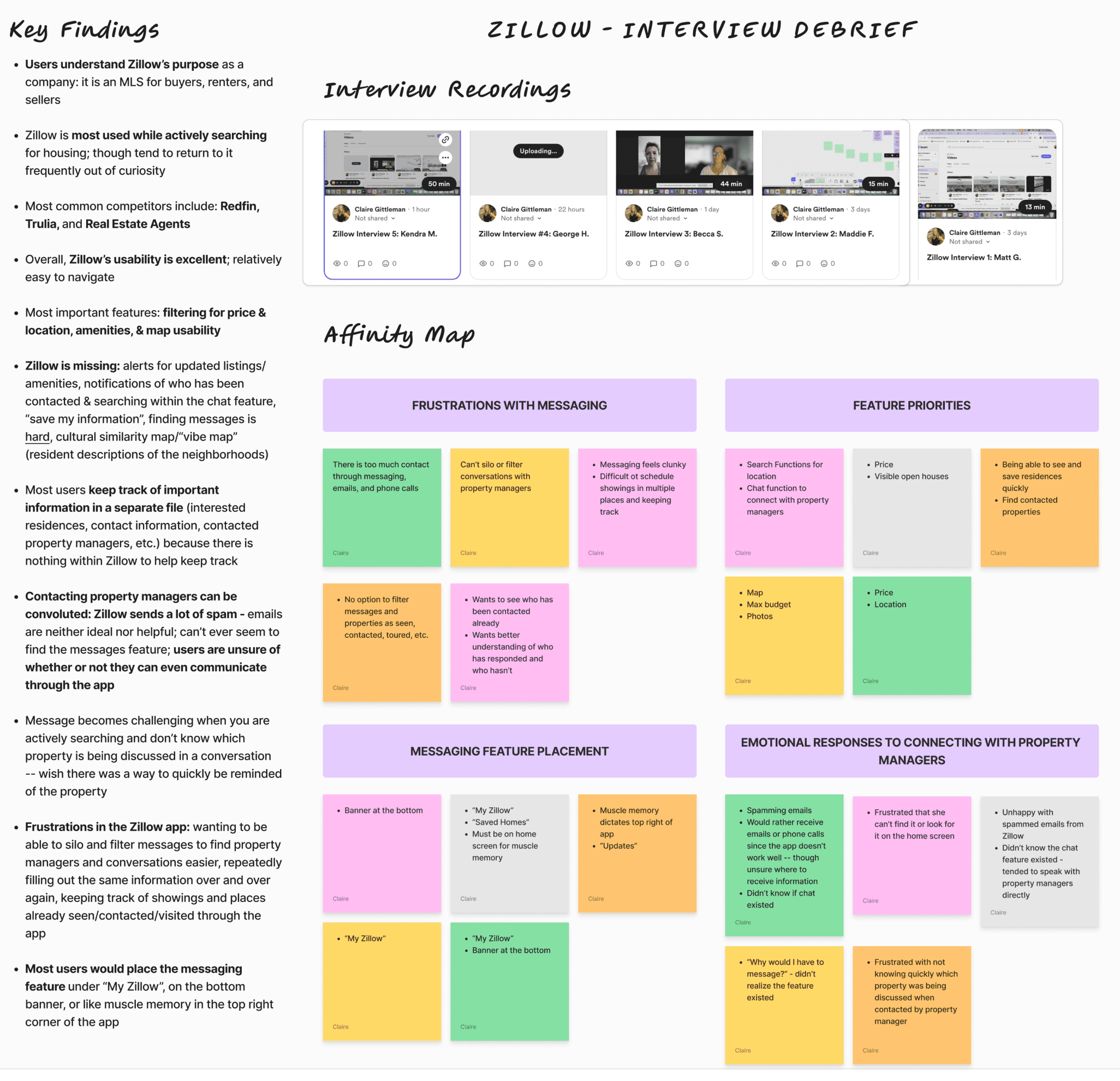 I interviewed 5 users familiar with Zillow’s app. During each interview, I felt it was important to have each user test Zillow’s current (summer 2024) app and have them look for the messages feature and think about how they would contact a property manager. My hypothesis was confirmed during this testing as 100% of users struggled to find the messaging feature and were visibly and verbally frustrated in the process.