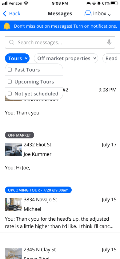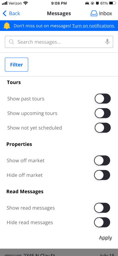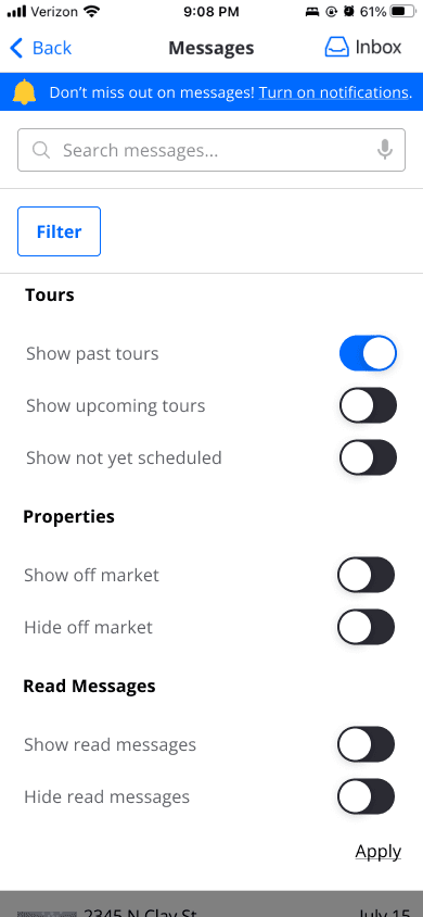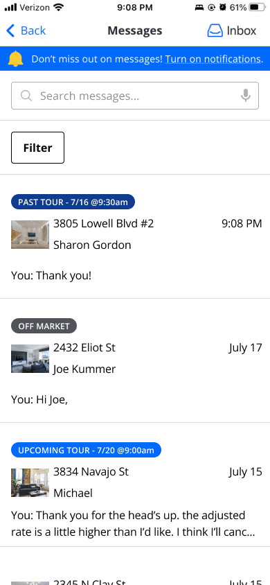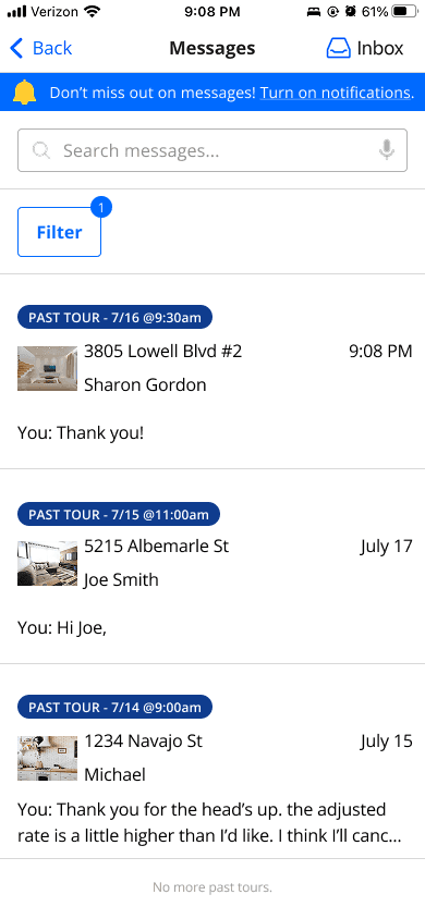 Using the LoFi usability testing, I was able to develop HiFi mockups that addressed user feedback. Every user agreed that placing the messaging feature in the top right of the screen felt intuitive and they agreed that being able to filter messages would be a game changer. Users also discussed the types of categories they would like to see filtered such as: past, upcoming, and not yet scheduled tours, read or unread messages, and off or on market properties.