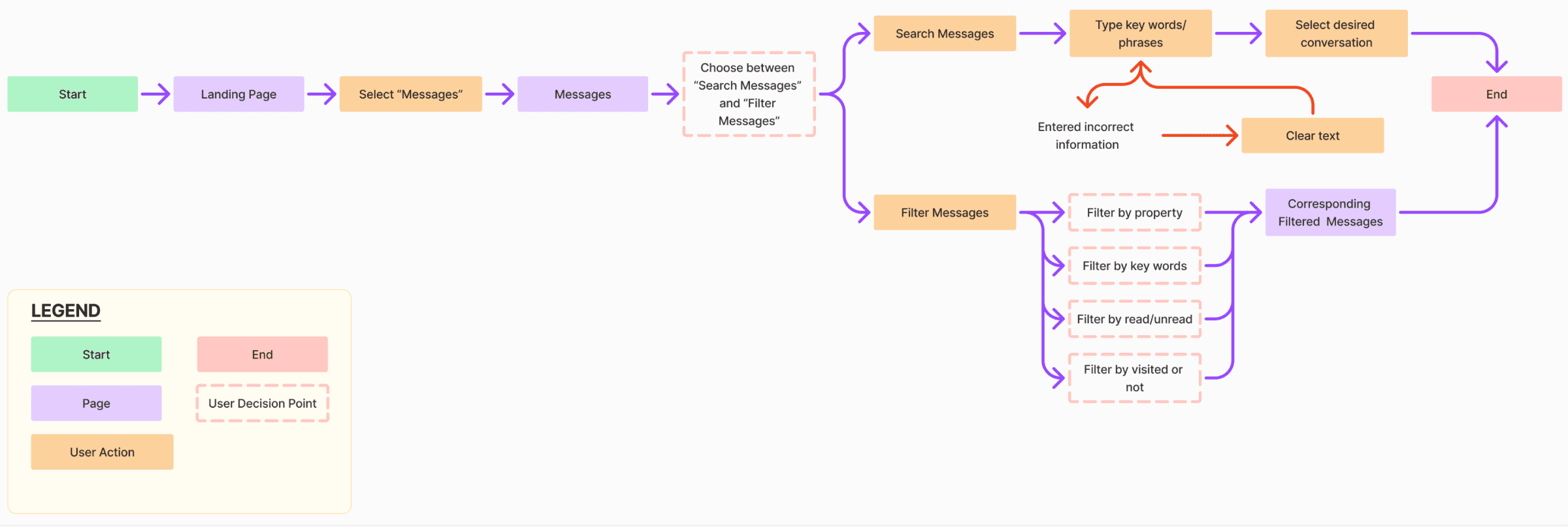 Conducting user interviews and competitor analysis was vital in narrowing down the focus for next steps, now I wanted to visualize what users would need to do in order to have a better experience. I created user flows for starting a new conversation and filtering messages
