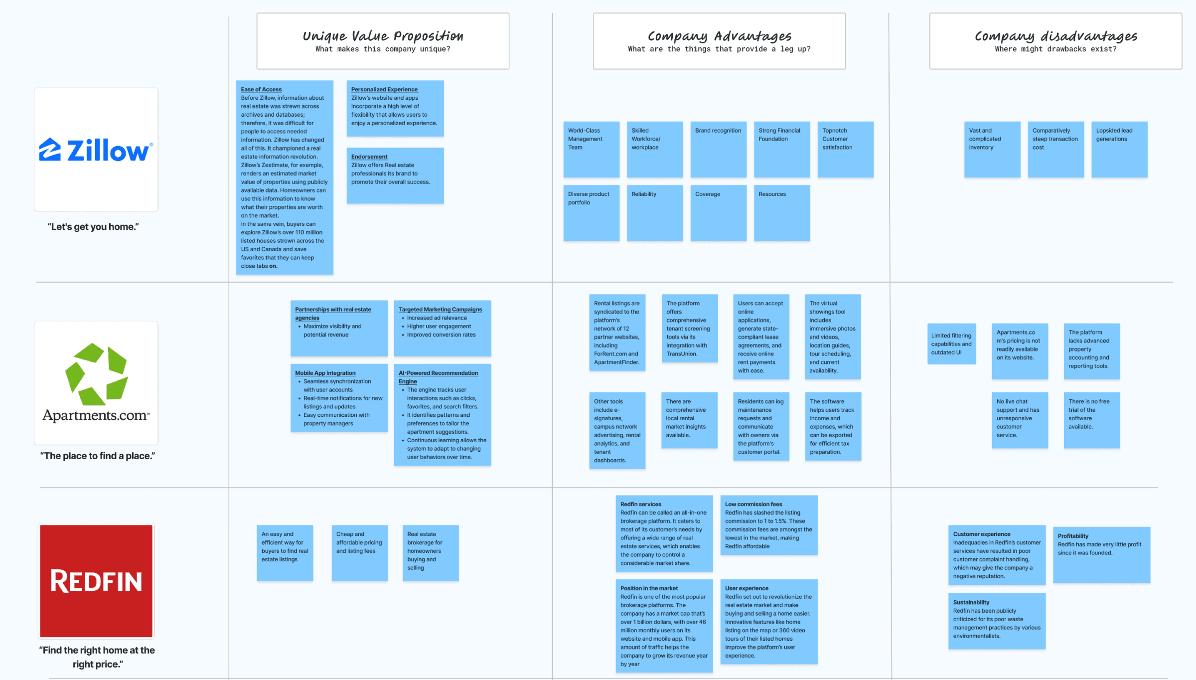 Starting my research process, I was curious about Zillow’s competitors and wanted to know how companies like Apartments.com, Redfin, and Trulia compared to each other, but especially to Zillow. This felt like a crucial step for me as it not only provided me with insight into the intricacies of these companies, but it also set a standard for what to expect within the real estate industry; a field within which I’ve never worked so learning its systems and standards was important.