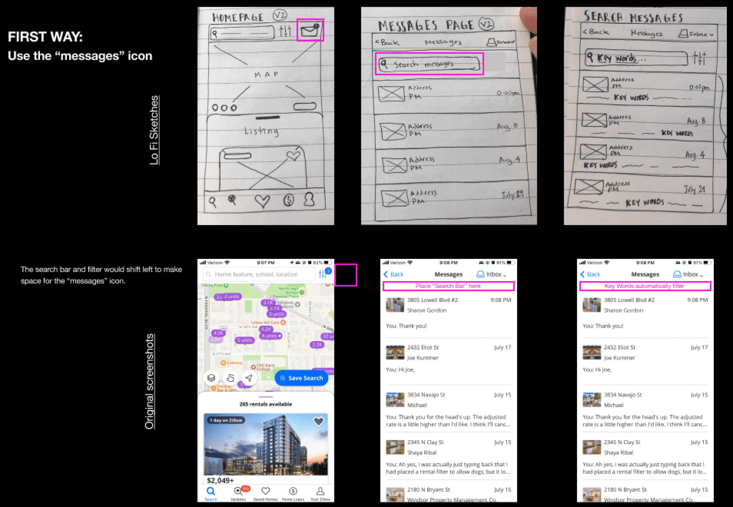 In order to better visualizes the changes that I was trying to make, I paired my LoFi wireframes with the current (at the time) versions of Zillow’s same screens. This helped users during LoFi user testing to get a better sense of what they were looking at and what changes were being made. Users commented that the new flows felt a lot more intuitive and they appreciated the additional elements like filtering through messages both with a search bar and preset filters.